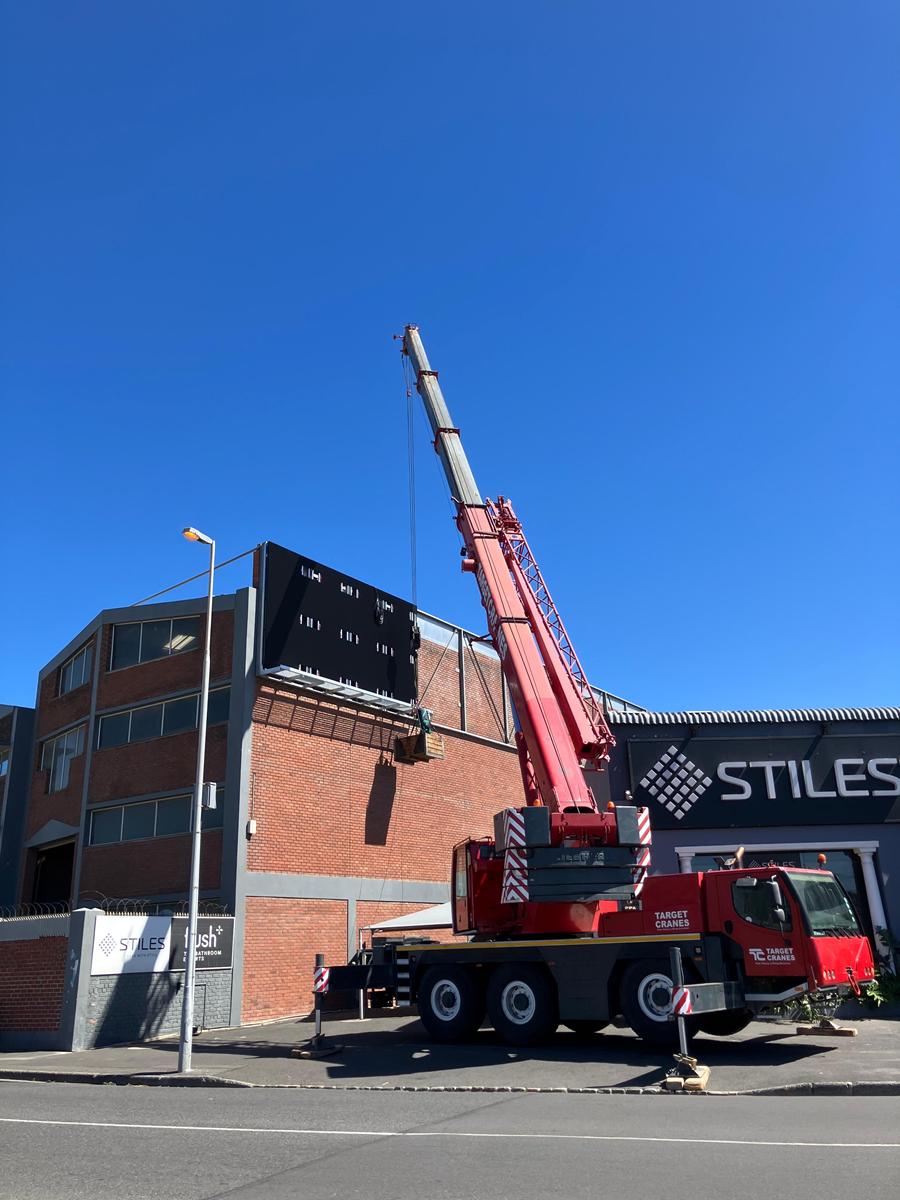 Installation required coordinated lifting operations using a mobile crane system within a busy commercial area.